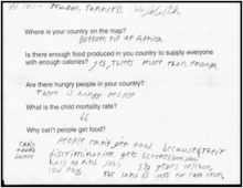 Students then worked in small groups, each focusing on a fact card from a specific country. They had to determine if enough food could be produced by the country to support its population, how significant the hunger problem was within that country, and why people were going hungry. They read and discussed the fact card together and recorded their thinking about these three questions. Each group shared their findings with the class so that students could then compare issues across countries. Students were surprised to find that even in countries that they had seen as impoverished, such as India and Rwanda, enough food could be grown to feed everyone but that the land instead was used for cash crops like coffee or tobacco or the food was not equally distributed among the people of that country. They also realized that people can work hard but not be paid enough to buy the food they need and that some governments sell their food to other countries, even though that means their own people go hungry.
