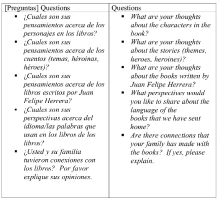 We used thematic analysis while identifying and classifying the families’ perspectives. We looked at the survey responses in terms of topics, meanings, and themes and we attempted to create a picture of collective experiences (Taylor & Bogdan, 1984). We constructed webs of the responses from each survey and identified themes throughout this analysis. We identified four categories of family perspectives related to cultural authenticity: Themes and Stories/Cuentos, Qualities of Characters, Language of the Book, and Local Knowledge of Insiders. Families viewed the stories in the literature as holding importance in terms of relationships and teaching that was muy educativo . They examined the strengths of bilingualism and saw language as a resource (Ruiz, 1984), positioning themselves as learners through learning another language. As insiders, they referred to knowledge of cultural membership and details of authenticity.