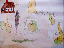 "There is a form of blockage which starts much before the students even think about speaking," shares Elizabeth, connecting to experiences with students in her drama classes. Dini's notes state that Darren and Sheeana were speaking in English. "When they begin to talk about the book, even though it is retelling, Darren seems to have difficulty explaining things in English. He switches to French. Sheeana switches to French too and seems more comfortable. If Darren and Sheeana are having difficulty retelling in English, it is not likely that they will be able to talk about journeys from the book in English. It may be above their level of understanding. The criteria here is not accuracy in language, it is fluency of thought. The ideas and thinking processes are more important than the language the children are speaking in. It is acceptable for children to speak in the language in which they feel most comfortable and are proficient in so long as they can communicate their ideas. We have to remember that children are learning language as well as learning concepts. These are happening at the same time. We may be able to reduce the disparity between first and second language speakers by making children more at ease so they express themselves in their mother tongue in situations where we are not working on accuracy." We wanted children to feel more confident with any language and be able to pull from a range of thoughts to express their ideas.