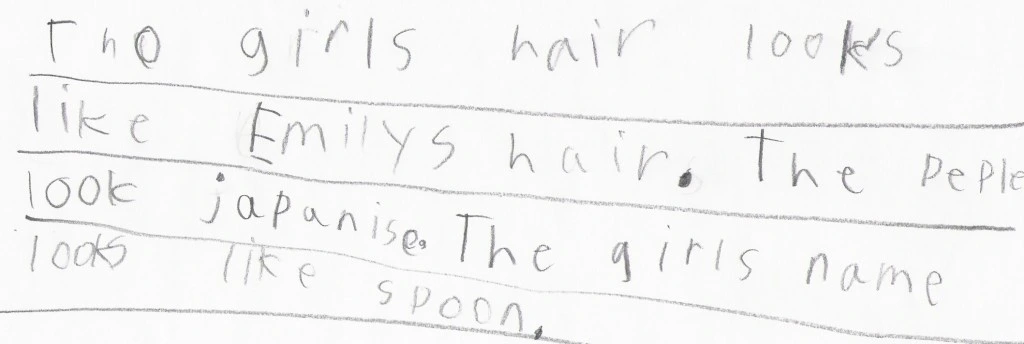 Casey also wrote that "the people look Japanese." When asked why he thought so, Casey explained, "They just do their hair and eyes and stuff."