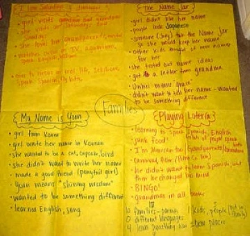 In our fourth session, the remaining two groups (of five children each) participated in the graffiti board technique with The Name Jar. None of the students appeared reluctant to participate as some of the previous groups had. I attributed this to the students' growing experience with literature response. Most students got right to work as I read, though a few children needed time to finish their ideas after the read-aloud. Again, each child shared his or her thinking at the end.