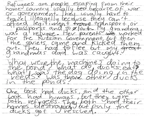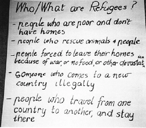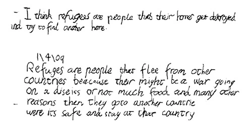 The work began with individual children in each school writing a definition to respond to the question “Who/what are refugees?” Several times throughout the inquiry children were given the opportunity to revisit these definitions and to revise them, if they so wished.