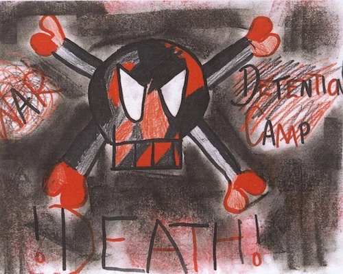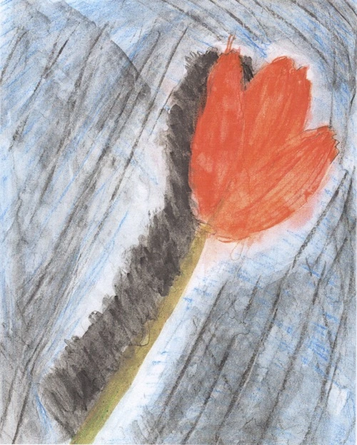 In this sketch-to stretch the child has represented the refugees’ lives as caught between war and the detention camp. In this sketch, the child has drawn a flower to represent the life of the refugees. The black colouring along the left hand side illustrates the deteriorating quality of the refugees’ lives and the death of some of them.