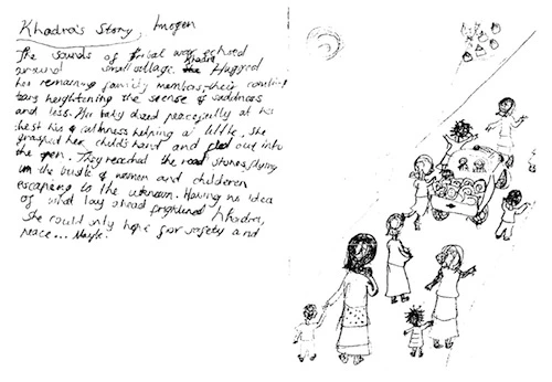 Interestingly for me as a teacher, I learned more about the children’s understandings of Khadra’s flight from their art work than from their writing. For example, while some children used the word ‘village’ in their writing, their drawing showed a high rise apartment building.
