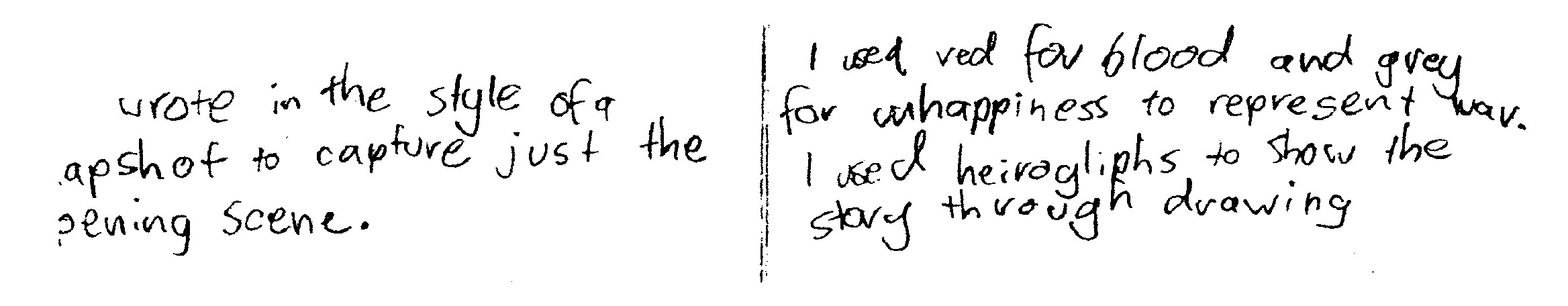 One activity we did required the children to use two different art forms, writing and drawing, to show their understanding of an event. They were asked to write, and then draw the scene where Khadra, one of our Somali visitors, fled her village. When completed, the children were asked to make notes about how they made meaning by writing and by drawing. I asked them to consider: Which elements of each expressive form were available to them? How did it differ to make meaning by drawing rather than by writing?