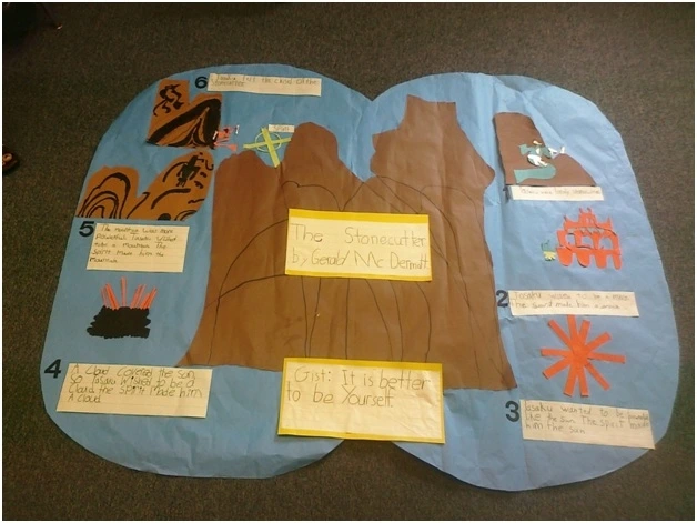 After we shared folktales like The Stonecutter (McDermott, 1975), the students worked together to create murals retelling important parts of the story.