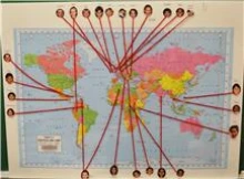 The teachers plotted the families’ origins on their maps and connected a piece of string from a picture of the child outside of the map to his/her family’s place of origin. The map from Michelle’s classroom is found in Figure 1.