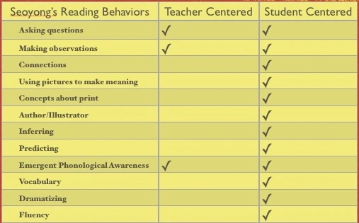 After every warm up reading, I strategically placed a new read aloud on the table. The novelty of a new story to enjoy was very attractive and I could count on Seoyoung to select this book for me to read aloud. We would take our time during the interactive read aloud, building upon the rich meaning making she exhibited and exploring new terms that emerged from the text.