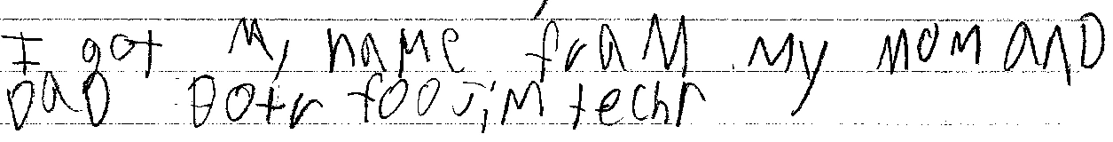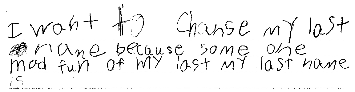 Miranda speaks Spanish and English. Like Johnny, she receives ESOL instruction. She decided to rewrite her own understanding of the story by situating her name based on the vocations of her parents. Rene, the character in the story, explains why he has two last names to his classmates by sharing his family tree. He acknowledged that his grandparents helped him become who he is now. He cannot just be Colato from his mother’s side or Lainez from his father’s side. He is Rene Colato-Lainez. In much the same way, Miranda acknowledged her family name but also added the vocations of her dad as a doctor and her mom as a teacher. By writing the origin of her name, she linked her own experience with that of Rene (Colato-Lainez, 2009) who also explained his last name in the story and linked them with his family’s talent and work. We see how Miranda was re-writing her own world in much the same way as Rene did in the story. This provides us with a platform to share more about ourselves and our families. Another example comes from a fourth grade monolingual speaker, Mark, who forged a sense of sharing when he wrote in his reader response journal and shared the following in our class: