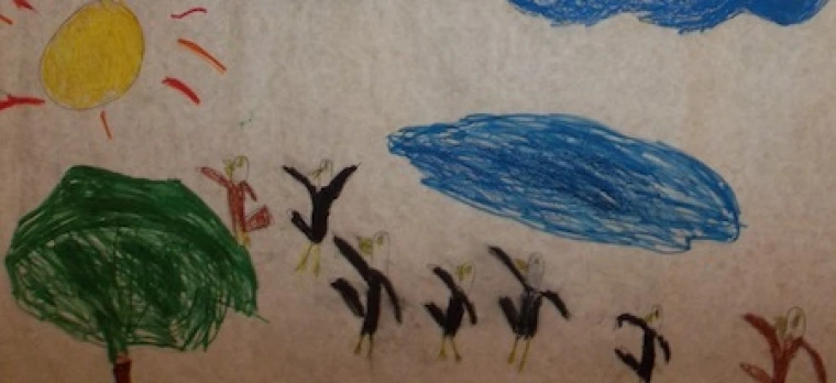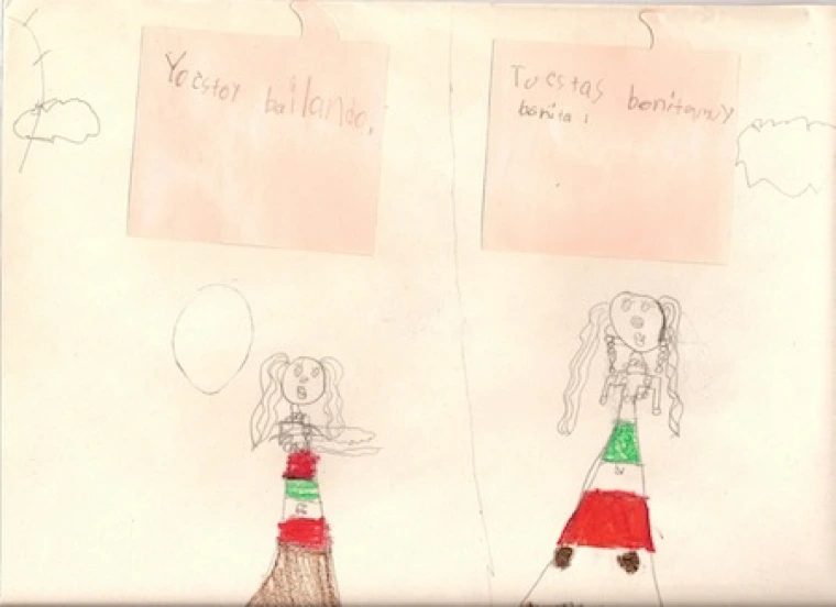 In part, the first-graders’ tendency to mix historical, cultural and political categories reflects their developmental stage. Thus, one child wrote to César Chávez—certain that he would reply— “Ya sé que tú vives en California. Nosotros vivimos en Estados Unidos. De seguro tú tienes familia. Bueno, en Estados Unidos también cada uno tenemos familia.” At the same time, this crossing of boundaries reflects a lived experience in which identity constructs intermingle and overlap. Recurring images of eagles in one child’s responses to the books might symbolize the United States or Mexico—or both (see example in Figure 4, below). And although Me llamo Celia emphasizes Cuban identity, one student depicted herself dancing with the Queen of Salsa, both dressed in skirts made from the Mexican flag (see Figure 5, below). “Yo estoy bailando,” , says the child in a cartoon bubble. “Tú estás bonita, muy bonita,” , answers a nearly identical—but taller-- Celia.