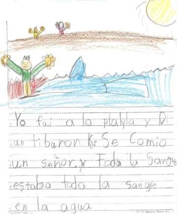 While it was more common for the children to bring the characters into their own world, in one instance many of the readers easily crossed into the realm of the characters. In response to young Carmen’s encounter with a dead shark on the beach in Cuadros de familia, several children filled their family albums with gruesome narratives of their own—surely fictional— harrowing encounters with sharks. In one drawing, for example, a child and father stand in the background on the beach, observing a gory shark attack (Figure 7). The accompanying narrative begins, “Yo fui a la playa y vi un tiburón que se comió un señor. Y toda la sangre estaba toda la sangre en la agua” . The child goes on to describe throwing meat in the water in an effort to distract the shark.