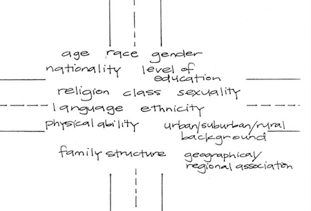 Identity intersections are created when one carefully considers how different aspects of a person’s cultural identity have shaped her/his life. This includes membership in easily recognized cultural groups based on race, ethnicity, religion, language, socioeconomic status and gender, but also other types of group membership such as geographic region, education level, physical ability, and family. Although the identity intersection begins with the format developed by Foss (2002), students are encouraged to add or remove any aspects that they perceive as important or unimportant to the cultural identities under examination. Students often choose to add memberships in groups based on professions and hobbies to their identity intersections.