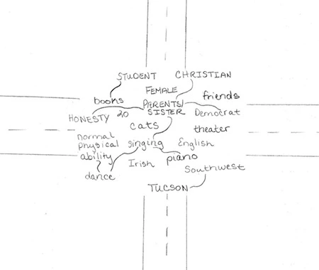 Elena used Foss’ basic format and included many of the aspects that appear on that format, including age, gender, religion, language, ethnicity, physical ability, geographic association, and family structure. She also added her political affiliation and hobbies/interests. Elena did not include anything about her race, nationality, or sexuality, most likely because she did not believe that they influenced her life in a significant way.