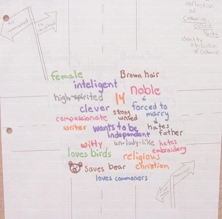 In her identity intersection, Jenny included aspects such as gender, age, class and religion. She also added many personality traits. Jenny brought this identity intersection to her small group literature discussion and shared her work as the group began talking about the book. This gave the group an initial direction. Throughout the discussion, Jenny referred back to the identity intersection, explaining why she included these particular aspects and connecting them with specific events in the book. The group spent a long time talking about what it would be like to be female in medieval England.