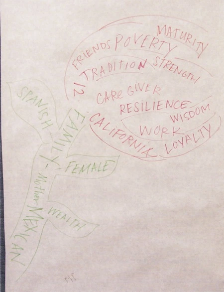 Mara chose to modify Foss’ format into an organization more meaningful to her life. She included aspects such as age, gender, religion, class, ethnicity, urban background/geographic association and family structure. Like Elena, she added political affiliations. She also added some values and personality traits. Mara chose not to include anything about her race, sexuality, language, or physical ability.