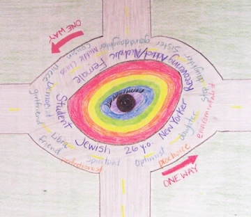 I made my identity intersection a one-way circle because right now in my life, things are pretty circular. Eventually, when I graduate next May, I will exit onto one of those streets. My life is one-way because I don’t believe in going backwards or having regrets. I try to learn from my experiences and grow from them, always moving forward, closer to my dreams.