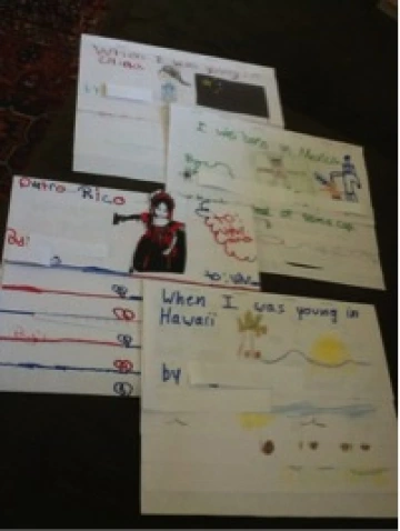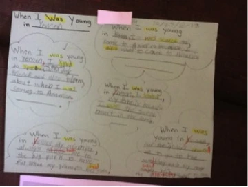 Cynthia Rylant’s (1982) When I Was Young in the Mountains inspired our own “When I Was Young” books. Some students wrote about their native countries: When I Was Young in Yemen, When I Was Young in Puerto Rico, When I Was Young in Mexico. Others chose to write about their memories in America: When I Was Young in Pre-School, When I Was Young at Yates (another school in our district which the student attended her first year after arriving from Puerto Rico). Students worked in pairs to help each other plan their writing and complete a basic graphic organizer. They bounced ideas off each other, edited their writing based on ideas they liked in their peers’ writing, and shared in front of the group. Students brought precious photographs from home to be photocopied to help illustrate their books. We printed pictures of flags and landmarks and other photos they requested from the Internet, and they filled in with their own drawings. All the while, our language objective was using past tense verbs. The students presented their books to the class, and I videotaped them reading their books. Some students chose to bring a friend to the front of the room when they read their story to the class. There was applause and appreciation for each child’s story and an eagerness to share their books with their peers and parents.