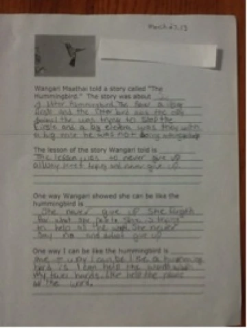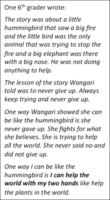 We empathized with Wangari Maathai who was shocked when she saw the effects of deforestation in Kenya that occurred while she was away from her country studying for her doctorate. She used her knowledge of science to combat the problem by planting trees and encouraging others to do the same. This led to the Green Belt Movement. We were inspired by the metaphorical story she told (in a video clip) of a hummingbird trying to put out a massive fire while bigger animals, with more power to help, stood by paralyzed by the enormity of the task. The hummingbird, although small, was doing his best, and Wangari said she was like the hummingbird—just doing the best that she can.