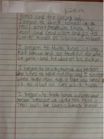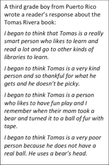 When we read Rylant’s book, one of the third graders from Mexico was struck by the similarities of the narrator’s experience in the distant past in rural America and his own memories of living in Mexico. While some of his peers were surprised to read about the narrator’s simple life with her grandparents and needed some explanation for some of the events in the book, this third grader knew what an outhouse was, describing life in a house with a dirt floor and pumping water from a well to drink. He knew what it was like to live close to the land. His text read: