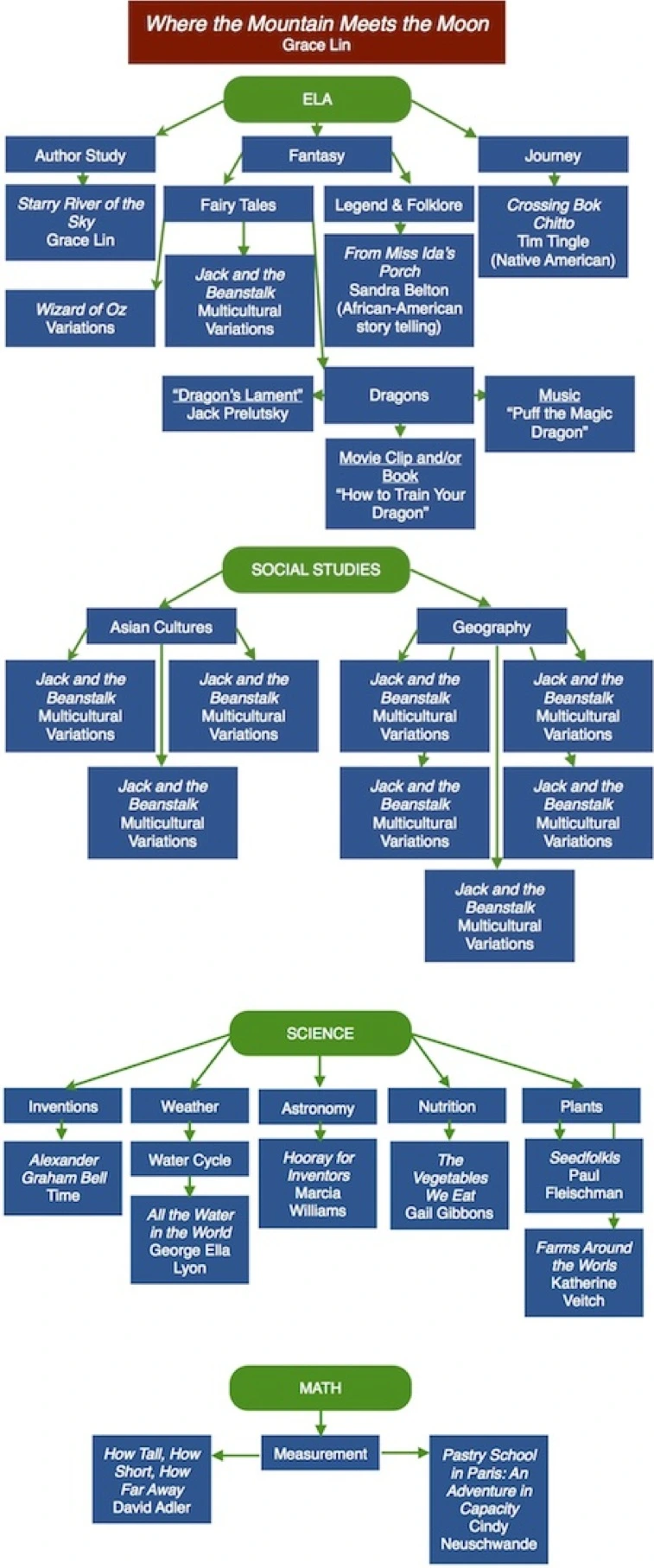 I read Where the Mountain Meets the Moon over our winter break and immediately fell in love with the story. I started to think about the many different ways this book could be used as an anchor text across the curriculum in an elementary classroom. To organize my thoughts, I created a web illustrating how this story could branch into different elements of an elementary grade curriculum including Language Arts, Science, Social Studies and Math. Once I started to compile the cross-curriculum subject areas I pulled from Where the Mountain Meets the Moon, I knew I wanted to select global literature to enhance each area.