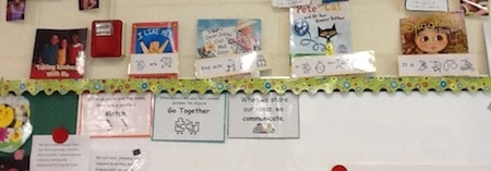 As in the previous year, I read lots of global literature to the children. Nine of the books were particularly strong and so I decided to revisit these books with students throughout the year. I created a book wall above our chalkboard by the carpeted area so that the books were available to use as a reminder, to compare, and to reread as a favorite read aloud. By the end of the year we had a line of books on our wall. I taped a sentence strip to the book that included board maker pictures and summed up the message in one sentence (see Figure 1).