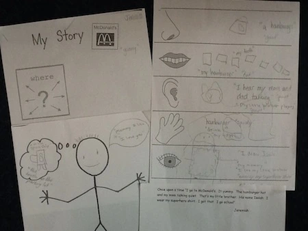These experiences helped children recognize that everyone has a story and apply this thought to artists we studied in our Baltimore Museum of Art program on Language through the Arts. We realized that we can all be artists and authors and tell our own stories. Later in the year, at the end of our unit on the senses, the children chose a picture of a place (their home, McDonalds, Walmart, Target, grandparents’ home, etc.) as their setting and drew other parts of their stories. They told their stories by sharing what they would see, hear, taste, touch, and smell in the setting they chose. Jeremiah’s story (see Figure 4a) was, “Once upon a time I go to McDonalds. It yummy. The hamburger hot and my mom talking quiet. That’s my little brother. His name Isaiah. I wear my superhero shirt. I got that. I go to school.” Amaya’s work is in Figure 5. Her thinking bubble says, “Hearing the ocean. I can hear the sea shells swimming.” Through all of these experiences the students realized they were writers and artists.