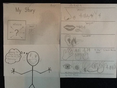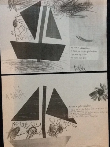Taya wrote, “My boat is beautiful. It takes me to my grandmother’s. I go with my sister. We read and play.” Amaya wrote, “My boat is pink and fast. It takes me to the Dollar store to get some swim stuff for swimming class. I go with my mom and my dad and my brother and my sister and my grandmother. We play my video game Pokey Says.”