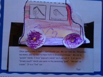 Finally, we read Amelia's Fantastic Flight (Bursik,1992) and talked about how that book was Amelia Earhart’s story and that every person has a story! We then read If I Built a Car (Van Dusen, 2005) and the children decorated their own cars. The children dictated their stories by responding to question words that I attached to their cars. Taya’s car is in Figure 4.