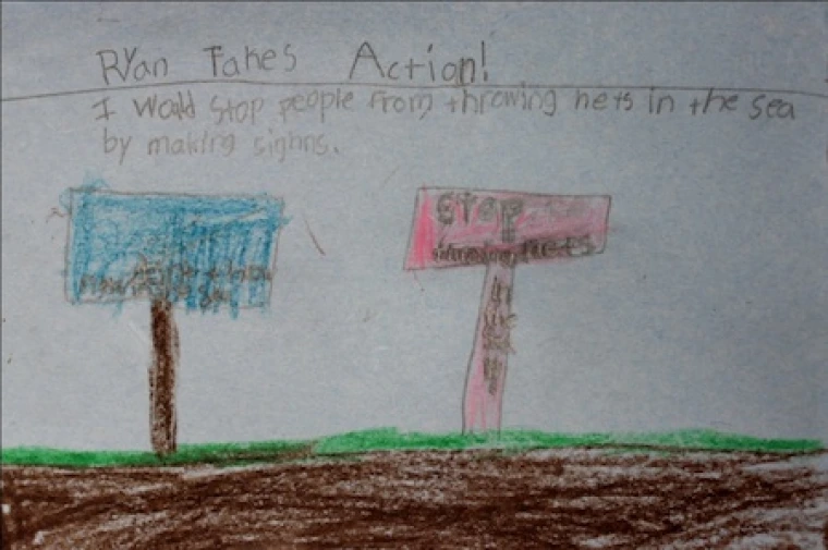 Ryan, who thinks “it is terrible that dolphins are getting stuck in nets and are dying,” decided to make signs to stop people from throwing nets in the sea (see Figure 10).