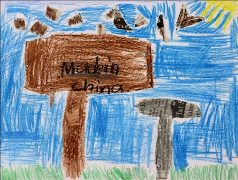 Colin spent many hours climbing in trees in his yard, and his mother often had a hard time getting him to come out of trees. He explained his artwork, “I made leaves and some leaves are different colors, because when you cut trees down, leaves get old and start dying…I was trying to make it sad.” The newspaper on the side of the tree is the branches that were being cut.