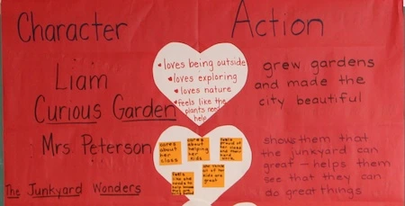 As a group, we worked together to add the elements on the white heart for the first two stories. Then I divided students into small groups to reread a story and identify what was in those characters’ hearts and the actions they took. The chart in Figure 2 shows a sampling from our Heart Chart.