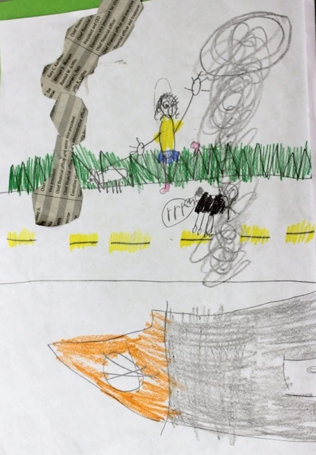 I asked the students to choose a problem that was important to them and create artwork like Roviera’s to show that problem. The students selected and depicted in their artwork a wide range of problems. For example, Reid’s artwork was about the tornados that devastated parts of Oklahoma at the end of the school year (see Figure 5).