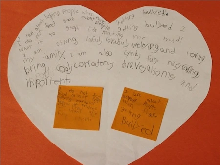 When connecting what was in her heart when she thought about taking action with the problem of bullying that she identified, she wrote on her sticky notes, “I do not feel good about people bullying each other because it makes me mad and I want to help them. I care about helping people when they are getting bullied.”