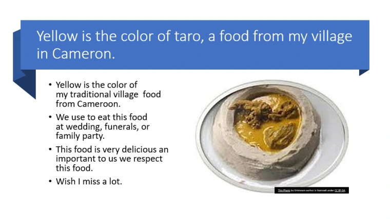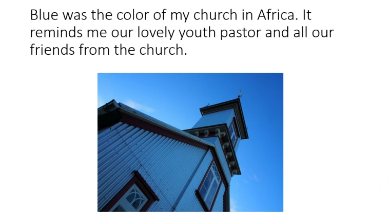 After the books about kindness, we looked at a book about identity that we then used as a mentor text. Golden Domes and Silver Lanterns: A Muslim Book of Colors by Hena Khan and Mehrdokht Amini (2015) is a book that explores a young girl's culture and faith through the colors of things that are important in her life. She talks about the red rug that her father uses to pray, the blue hijab worn by her mother, and the golden dome of the mosque that her family attends. We started this lesson around the time of Ramadan and some of the students were observing the holy month by fasting. We had a guest teacher, an Arabic speaking Student Support Specialist, tell us about how her family observes Ramadan and give the class a brief introduction to some of the vocabulary around the holy month. We learned the words for colors in English and matched them to the vocabulary from the book. This text became our template, using the phrase that is repeated in each page of the book, "(A color) is a ...," for example "Silver is a fanoos, a twinkling light, a shiny lantern that glows at night." I asked our French and Kinyarwanda-speaking interpreter to assist the class as they worked on individual PowerPoint presentations to help them put ideas on paper and to be there if students needed support in their home language, as some of the slides students created touched on topics that could bring up strong memories and emotions. Here are some student samples: