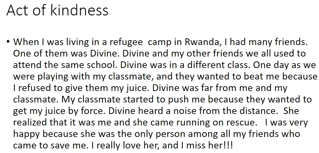 I chose three picturebooks that had at least one act of kindness that could serve as a common theme: Thank You, Omu! by Oge Mora (2018), A Drop of the Sea by Ingrid Chabbert and Raul Nieto Guridi (2018), and Salma the Syrian Chef by Danny Ramadan and Anna Bron (2020). We previewed and practiced important vocabulary, then read the story aloud as a class. Students practiced making predictions and completed a notetaker card to record characters, setting, plot, and identify the act(s) of kindness. After reviewing the different acts of kindness, I asked students to think of a time that someone did something kind for them and one time that they did something kind for someone. Here are two samples of student work: