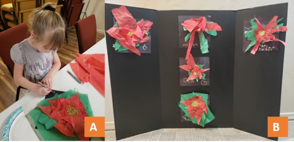 Students also learned about poinsettias in art class by reading The Legend of the Poinsettia (de Paola, 1997). This story of a young Mexican girl's first Posadas added to the students' background knowledge and understanding of Mexican culture (Laminack & Kelly, 2019). In art class, after reading the story, students made poinsettias out of tissue paper, glue, and glitter (see Figure 4-A). First, students examined the illustrations in the book to spark their imaginations of new possibilities for their poinsettias (Ray, 2010). Though the students all used the same mixed media, their poinsettias showed the diversity of their ideas and imaginations. The poinsettias were displayed for the families at the Posada celebration at the school (see Figure 4-B).