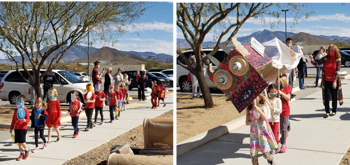 In preparation for our Chinese Lunar New Year celebration, students made red lanterns and drums out of construction paper and noise makers (simulating firecrackers) out of bowls with noise-producing beads and popsicle sticks as handles. They also colored dragon masks to wear. The real highlight, though, was creating the dragon for the grand finale in the parade. We used a big cardboard box for the head and attached a decorated sheet to depict the body and tail of the dragon. Students took turns over several days, using tissue paper for scales, paint, and paper cups with googly eyes, to attend to details to add to the dragon's authenticity. The parade was a success and many parents came to watch (see Figure 9).
