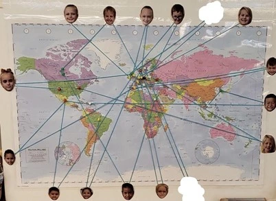 As students' understandings of their personal identities developed, we expanded to look at their families and ancestry. We read My Name is Elizabeth! (Dunklee & Forsythe, 2011) which allowed us to discover how special names are. Students gathered information from their parents and then shared in class what their names meant and how their parents chose their names. Students also found out where their ancestors originated and we marked the places on a world map (see Figure 1). Students began to realize that their family, cultural background and personal experiences impact who they are, how they think, and their actions. For a list of other books we read related to identity see Figure 1 in Martens and Martens' vignette "Developing a Literacy Curriculum with Global Literature" in this issue.