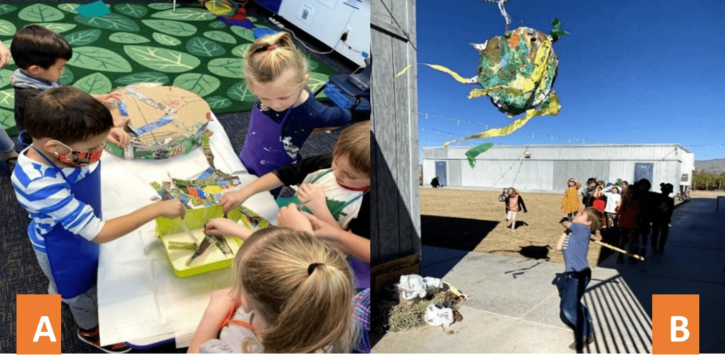 Figure 5. Students working on the star pinata (A) and hitting it as the class watches and sings (B).