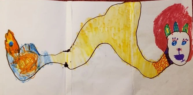 Chinese Lunar New Year. With great anticipation, students prepared for Chinese Lunar New Year and the Year of the Ox, which we celebrated on February 12, 2021. We read a number of books, including Chinese New Year (Marx, 2002) and Bringing in the New Year (Lin, 2013). The students loved learning about the lions and dragons that were part of the celebrations. They were surprised that Chinese dragons were considered lucky and good and not scary and dangerous as in most stories with which they were familiar. This helped extend and bridge the students' understandings of their own and Chinese culture. Grace Lin (2016) points out the need for children to "see things from other viewpoints... see outside of themselves". We added a fold-out page to the journals and students drew l-o-n-g snaky dragons as in Lin's book (see Figure 8).