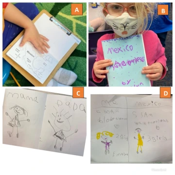 Emelyn titled her journal "Mexico Adventures" and noted how in Mexico children had a mom and dad like her but called them "mama" and "papa" (see Figure 2-A). After watching a short clip from Marc Kosak's 2020 documentary about how children get to school in Mexico, Emelyn compared herself to the children in the documentary. She made a t-chart about her observations, comparing wake up times, breakfast, siblings, and emotions (see Figure 2-B). She drew a happy face on the left side labeled "Me" and a sad face on the right side labeled "Mexico". She said, "I put a sad face because if I had to walk at 5AM, I would not be happy." Through these experiences, Emelyn and her classmates took a deeper look at culture and realized not everyone in the world lives like they do. They began to understand that children in other parts of the world are similar to them in some ways but also different. They learned to identify their own cultures as well as to distinguish and value cultural differences. Emelyn and her classmates crossed a bridge to experience life in Mexico and deepen their understanding of their own identities.