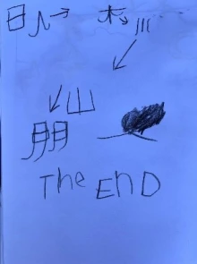 Figure 7. Avery’s story using Chinese characters. She used characters for “sun, person → tree → river → mountain → friend”.