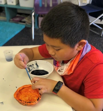 Figure 6. Liam (third grade) carefully adds his Hohokam-inspired design to his pinch pot.