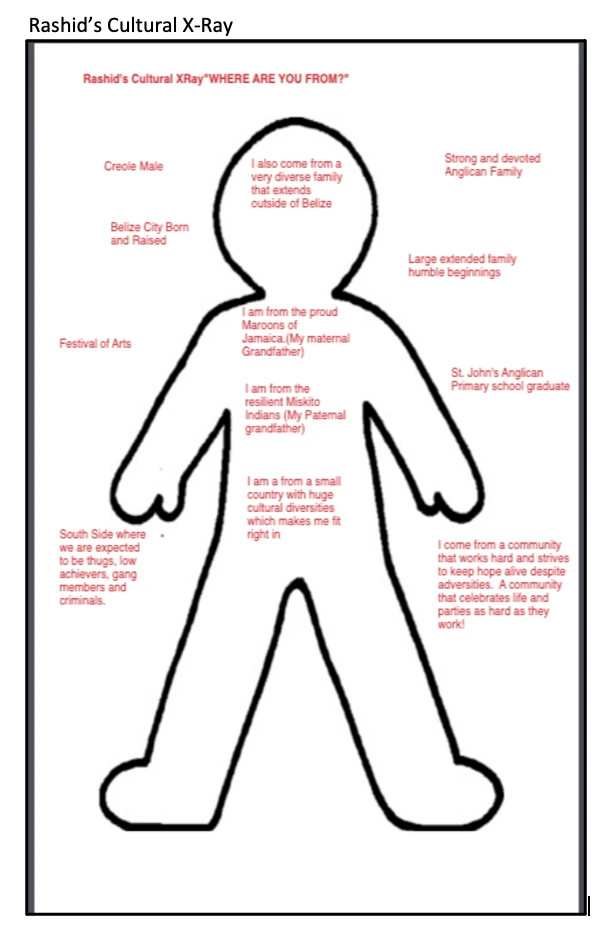 In response to Short's (2009) framework for engaging with international literature, we began with exploring and sharing our own cultural identities through journey maps and cultural x-rays (Figure 1), a process that launched storytelling, poetry, and art (Figure 2), and helped develop a stronger sense of community, especially across the Belize/U.S. divide. We paired Short's curricular framework with Leland, Lewison, and Harste's (2018) similar framework for engaging learners in critical literacy through literature. As our work centered on Belizean voices and agency, we reached back to previous readings in Freire (1970) and explored pedagogical implication of critical literacy with Lewison, Flint, and Van Sluys (2002). Wolf (2009), Peterson and Eeds (2007), and Parsons et al. (2011) were also instrumental in exploring ways to center literature in the curriculum and engage readers in critical, authentic, and agentic literacy.