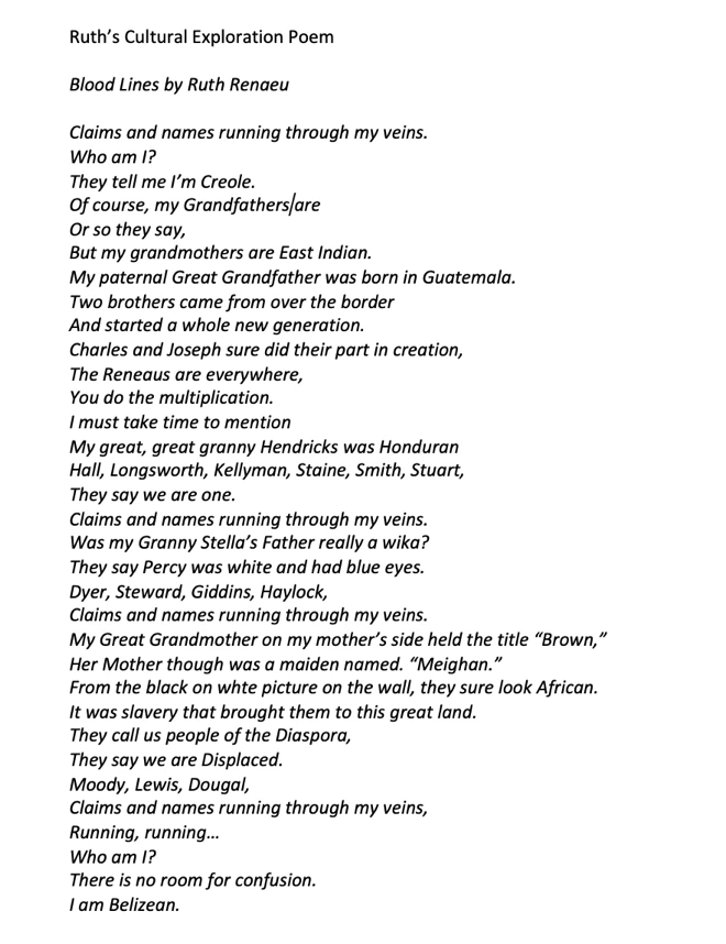 As a learning community, we considered what new action work would best serve our purposes for this project and decided on two areas of focus. First, we would reflect upon our changing stances as teachers as a result of engagement with multicultural literature. Second, teachers felt the need to amplify Belizean voices we had found to be so marginalized in the literature accessible to us. Some examples of this culminating work are included below.