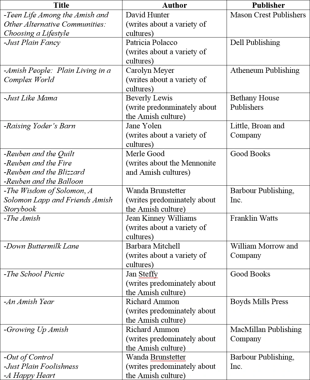 We decided to review Amish-themed children's literature to better expand our knowledge of the culture and to see if, and what kind, of trade books were available. Our initial questions included: what are the values and beliefs of the Amish, in what ways do Amish value education and educate their children, and how do Amish children's lives differ from mainstream society? When first starting this project, we searched via the school's library using key words such as "Amish" and "children's literature." From there, we decided to review the books listed below to see if there were themes which existed across the fifteen books that came up in our initial search. After reading the texts, we grouped the books according to themes and found overarching categories. Upon further research about the authors and publishers, we realized some of the publishers and authors were from the Amish culture or Mennonite culture, while others were considered cultural outsiders; that is, authors who research and write about a variety of cultures they are interested in but not necessarily a member of. The publishing dates of the children's books ranged from 1976-2009, and so we wondered if the traditions presented still exist today.