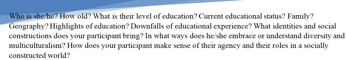 We began the assignment by interviewing an adult or child. Candidates created a list of interview questions (See Figure 3) to conduct a semi-structured interview (Cohen, Manion, & Morrison, 2007). A semi-structured interview was chosen because it invites conversation-like dialogue and ensured candidates collected the data while letting them pursue avenues of interest during the interview.