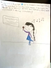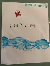 After sharing these books, we asked children to reflect on themselves and to come up with lists of where they are from using sentence frames, i.e., I am from _____ (place, family, tradition, everyday items, memory, food, etc.). Afterwards, we asked them how they spent their leisure time with their family. This inquiry helps children elaborate more on why they selected the words, sharing stories about their family cultures. Then, we asked them to share the meaning of their names and interests in either free drawing or writing to help them genuinely reflect on who they are and understand the name given by parents/caregivers. Hana, an American-born Japanese child, explained her name: Hana (はな) means flower in Japanese. She said, "My parents gave me this name. I was born in the spring season. Flowers bloom in the spring." When she shared her drawing, she explained her name is like a delightful melody flowing in the river in the spring. She drew a butterfly that enjoyed the beautiful sound by joyfully flying near the river. Hana named her drawing "Sound of Spring" (see Figure 4A). Another child, Aliyah, a second-generation, American-born Taiwanese, said that her father likes a singer named Aaliyah, so she was named after her. Aliyah shared that she actually likes singing like the singer Aaliyah. Her middle name is Faith because her parents hope she has faith in life. She further elaborated on the foods she likes and the sports she likes to do (see Figure 4B). These activities open the door for children to understand an array of family stories and cultures that shaped and influenced who they are.