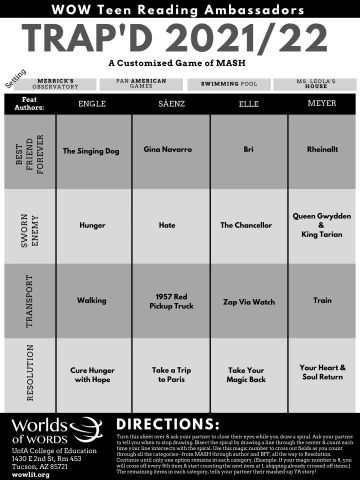 Even so, the idea was big enough to present to Worlds of Words' director, Kathy Short, which occurred during a road trip. With Kathy as captive audience, Rebecca outlined the initial program planning. As the field expert, Kathy recognized key ways to polish the plan by capitalizing off existing outreach that had proven successful, such as author/illustrator visits to the center. This programming is especially popular because everyone wants to meet a published book creator. What if Worlds of Words invited the authors of the books read by participating teens to the center? The teens could interact one-on-one with the authors and ask questions about the writing process and topics covered in the novels, as well as make a personal connection. This was the draw that the program needed. TRAP had a vision and a way to draw interest, excitement, and engagement.