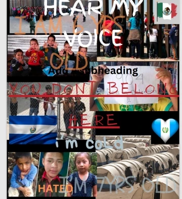 Lydia: "This collage depicts the children who were put into detention centers for crossing the border. As you take a closer look at the children, we see they each have a color bordered around them. These are what the following colors represent: red represents aggressiveness, blue represents dullness, teal represents fussiness, pink represents weakness, purple represents immaturity, white represents coldness, and finally truly inside the children is black which represents lifelessness.